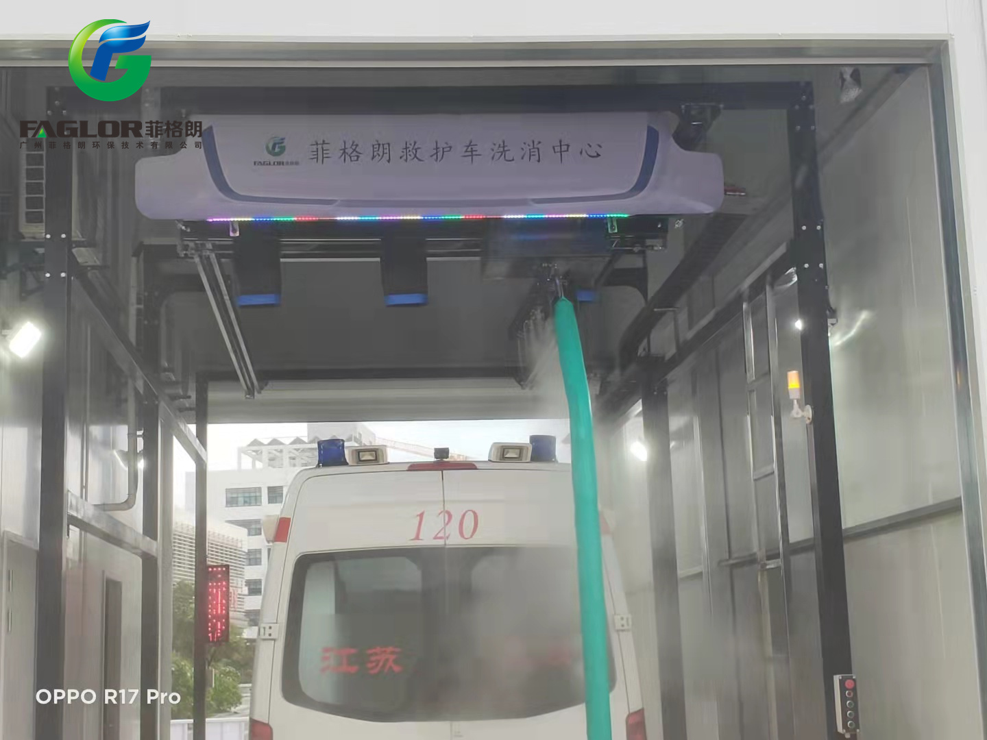 由于采用了串联式组合洗消,车辆自行通过,无需停顿间隔,节约了洗消时间,极大地提高了救护车洗消效率,是现代化的自动洗车、消毒的理想配套设施。